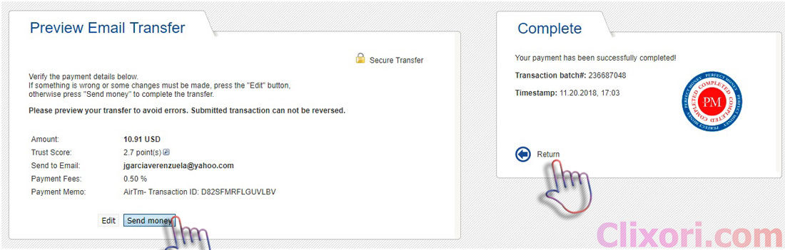 در ادامه برای تکمیل ارسال پول بر روی دکمه Send money و سپس بر روی دکمه Return کلیک کنید تا انتقال پول به همتای شما تکمیل گردد.